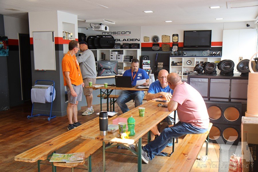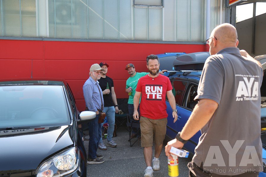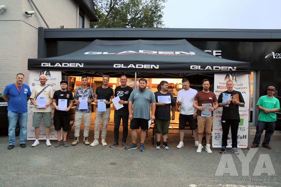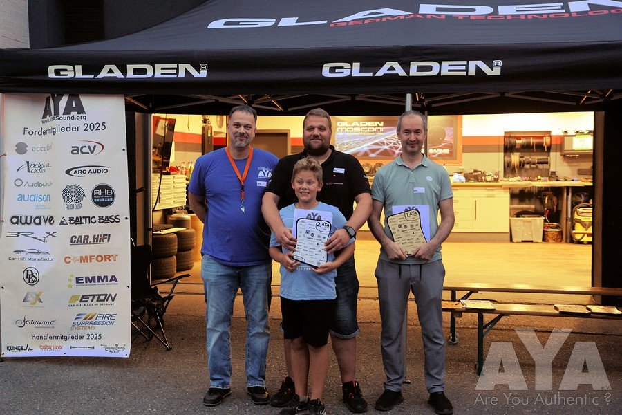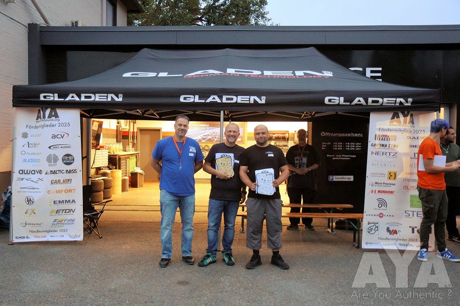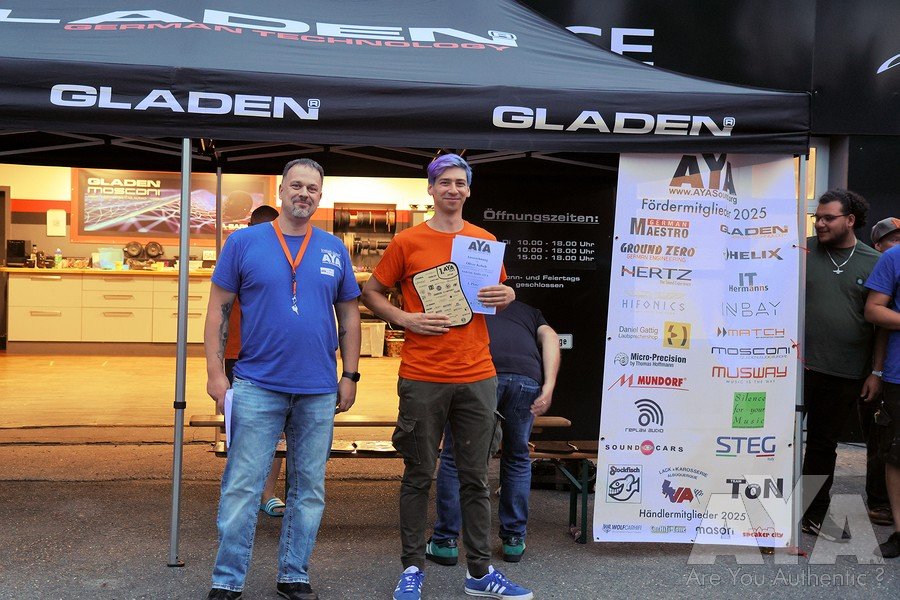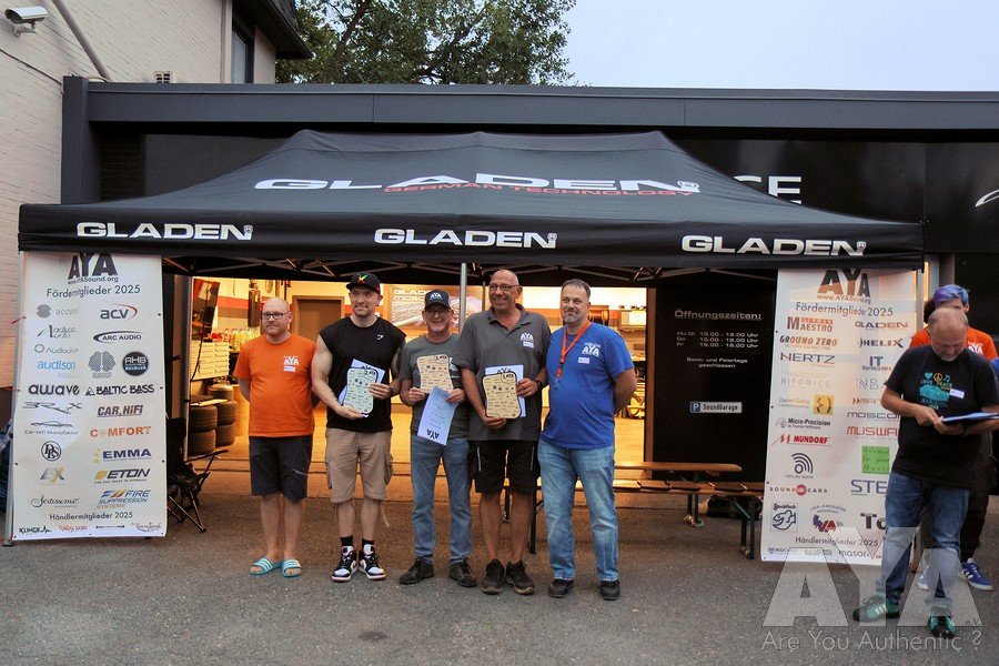 Die Teilnehmer waren nach erfolgter Sättigung entspannt genug, um vollzählig bis zur Siegerehrung auszuharren, die durch mehrere Stechen wegen Punktgleichheit und spontaner Ausfälle von Juroren erst um 19.25h starten konnte. Danach war noch 'Aftershowparty' angesagt, wo die Anhänger der lauten Fraktion eindrucksvoll zeigten, welche Pegelgewalten im Auto möglich sind. Während des Events und besonders der Bewertungen haben sich alle vorbildmäßig zurückgehalten - so wie man es bei AYA gewohnt ist!